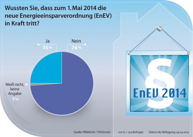 Rund drei Viertel der Deutschen wissen nicht, dass am 1. Mai 2014 die neue Energieeinsparverordnung (EnEV) in Kraft tritt. Zu diesem Ergebnis kommt eine repräsentative Umfrage des Meinungsforschungsinstituts TNS Emnid im Auftrag des Flüssiggasversorgers Primagas.
