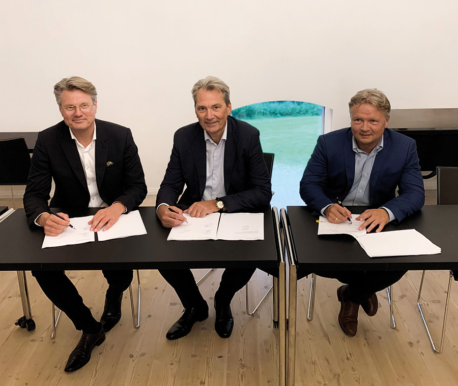 V.l.n.r.: Bo Larsen (CCO, Makeen Energy), Ole Hvelplund (CEO, Nature Energy) und Mikkel Seedorff Sørensen (CEO, Frederikshavn Havn) bei der Vertragsunterzeichnung. (Bild: Makeen Energy)