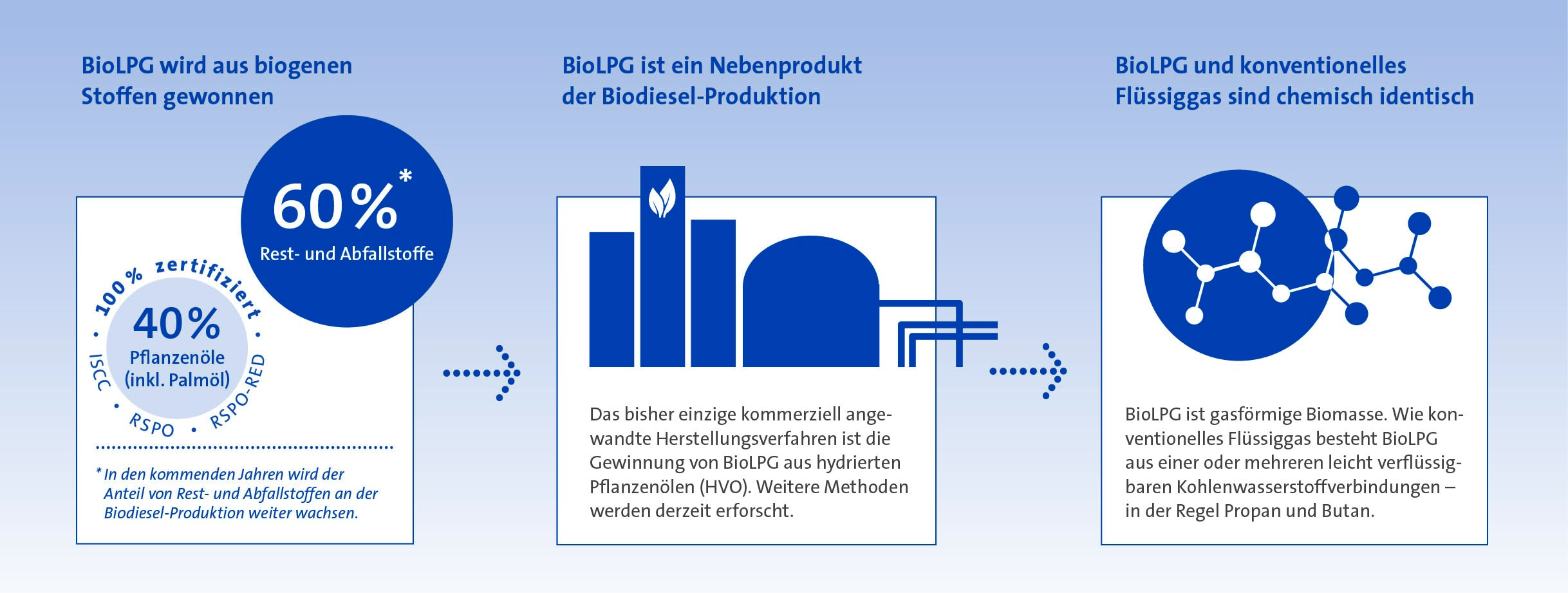 Konventionelles Flüssiggas und BioLPG sind chemisch identisch. Das bedeutet, dass sich der erneuerbare Energieträger in denselben Anlagen nutzen und im selben Behälter lagern lässt, eine Umrüstung ist nicht erforderlich. Kombiniert mit zeitgemäßer Heiztechnik, bietet der Energieträger den Komfort einer modernen Gasversorgung. Aus technischer Sicht ist die Anwendung von BioLPG im Wärmebereich praktisch ohne Einschränkungen möglich, da BioLPG aufgrund seiner DIN-Qualität Flüssiggas unbegrenzt beigemischt und sogar als alleiniger Brennstoff eingesetzt werden kann.