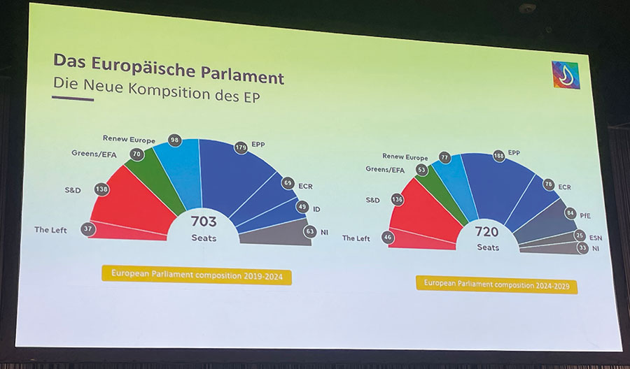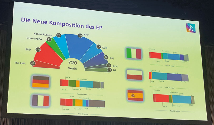 Die Zusammensetzung des Europäischen Parlaments hat sich wie folgt geändert: Der Anteil der Grünen ist zurückgegangen, die EPP (European‘s People Party) hingegen ist deutlich gewachsen ist. Rechts davon sind jetzt mehr Patriots for Europe (PFE). Immer noch wichtig: Die Kooperation von EPP mit der sozialdemokratischen Fraktion S&D sowie mit den Liberalen (Renew Europe). In den Ausschüssen haben die Grünen ziemlich viel Macht.