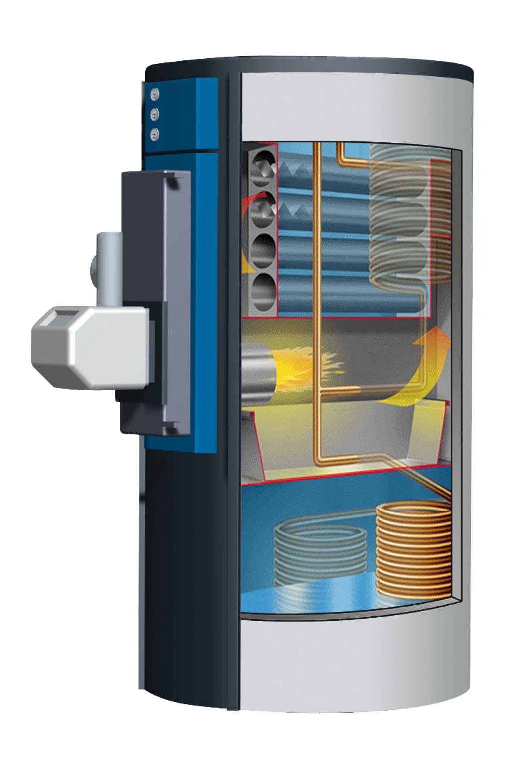 Der Speicherkessel MULTITHERMA von Westfa Flüssiggas und Umwelttechnik GmbH lässt sich flexibel mit einem Pellet- oder Gasbrenner bestücken. Alternativ kann auch der bestehende Ölbrenner übernommen werden.
