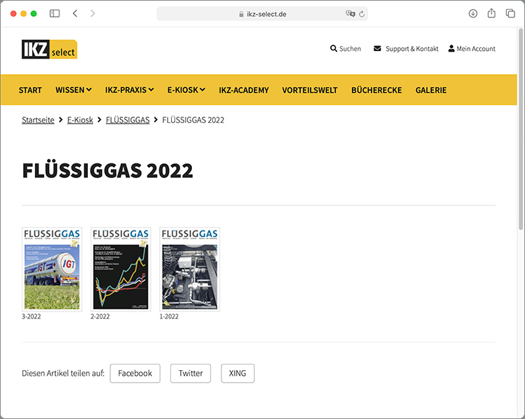 Seit Juni ist das Magazin FLÜSSIGGAS ab Ausgabe 1/2022 auch im E-Kiosk auf IKZ-select verfügbar.