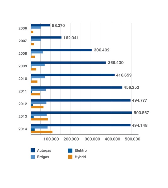 Mit knapp 500.000 zugelassenen Autogas-Fahrzeugen (Stand Januar 2015) besetzt der Alternativkraftstoff Nr. 1 etwa 70% des Marktes alternativer Antriebe in Deutschland. Hybrid- (15%) sowie Erdgas-Fahrzeuge (12%) folgen vor dem Schlusslicht Elektromobilität (3%). Alternative Kraftstoffe stellen insgesamt 1,6% des PKW-Bestands in Deutschland. Die Infrastruktur für Autogas ist im Gegensatz zu anderen alternativen Antrieben flächendeckend ausgebaut: Mit bundesweit über 6.900 Tankstellen kann an fast jeder zweiten Tankstelle Autogas getankt werden. Europaweit gibt es etwa 40.000 Tankstellen.