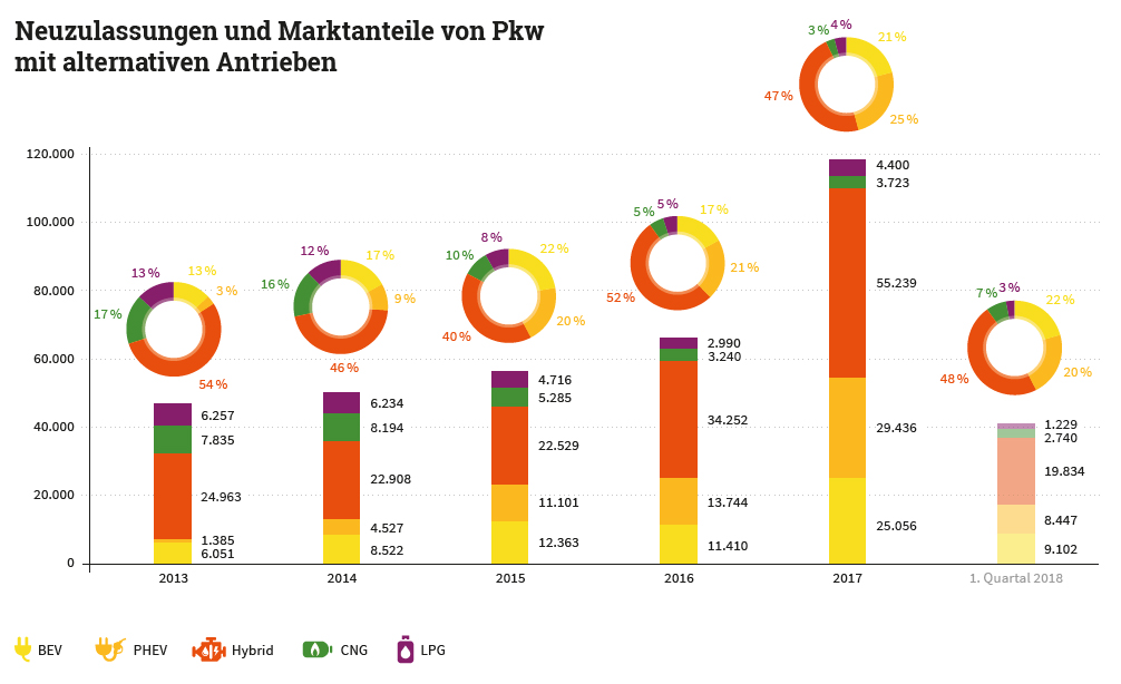 Die Nachfrage nach Pkw mit alternativen Antrieben steigt. Im ersten Quartal 2018 lag der Marktanteil von Fahrzeugen mit Elektro-, Hybrid-, Flüssiggas- oder Erdgasantrieb bei 4,7 %, im Vorjahresquartal waren es 2,8 %. Die Zahl der Neuzulassungen stieg im vergangenen Jahr um 80 % auf insgesamt 118.000 Pkw. Der Monitoringbericht „Alternative Antriebe in Deutschland“ der Deutschen Energie-Agentur führt die Entwicklung unter anderem auf die größere Auswahl an Modellen, die Diskussion um erhöhte Abgaswerte und Fahrverbote für Diesel-Pkw sowie Fördermaßnahmen wie die Einführung eines Umweltbonus für Elektro- und Hybridfahrzeuge oder die Verlängerung der Energiesteuerermäßigung für mit Gas (CNG, LPG) betriebene Pkw zurück.