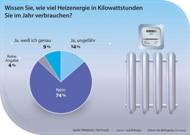 74 Prozent der Deutschen wissen nicht, wie viel Energie sie jährlich verheizen. Zu diesem Ergebnis kommt eine repräsentative Umfrage des Meinungsforschungsinstituts TNS Emnid im Auftrag des Flüssiggasversorgers Primagas. Diese Unwissenheit kann sich als Nachteil erweisen: Denn wer seinen Verbrauch nicht kennt, kann auch nicht beurteilen, ob er zu viel Geld fürs Heizen ausgibt.