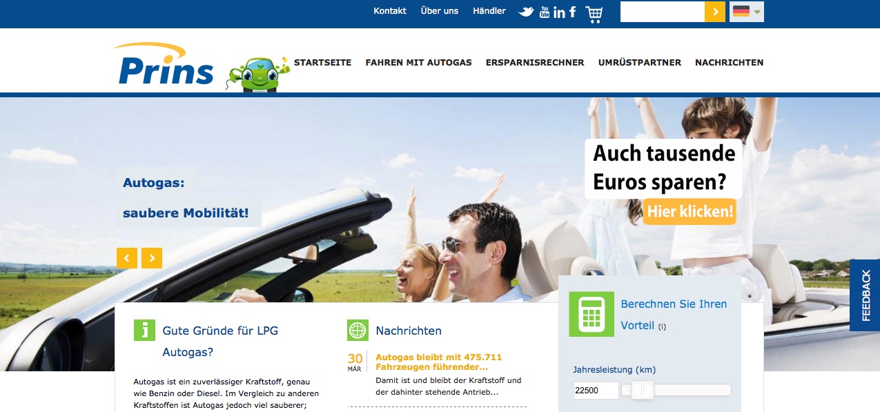 Es ist nicht immer klar, ob Fahren mit Autogas in jedem Fall günstiger ist als mit anderen Treibstoffen. Auf der neuen Website bietet Prins deshalb einen Ersparnisrechner an, damit man überprüfen kann, ob es wirklich in jeder Situation von Vorteil ist. Jeder Besucher kann sofort (24/7) online eine Anfrage stellen. Die Website ist zusammen mit Facebook, Twitter, LinkedIn und YouTube eine Plattform, auf der man Erfahrungen rund um Autogas austauschen kann.