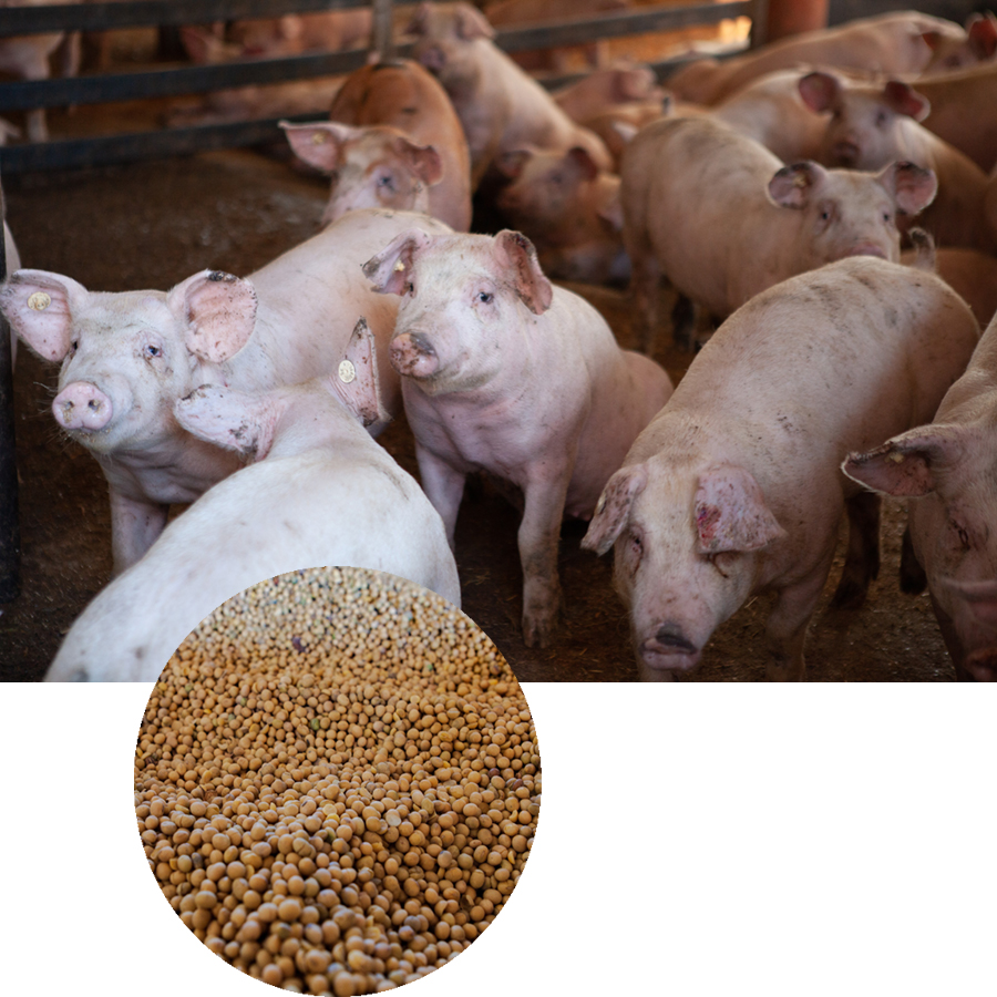 Die Sojabohne eignet sich besonders gut als Futtermittel für die Schweinemast: Mit ihrem hohen Proteinanteil von 35 – 38 % pro kg Frischmasse fördert sie besonders den Aufbau von Muskelfleisch, 19 % Fettanteil sorgen für den hohen Energiegehalt. Um zum bekömmlichen Futtermittel zu werden, muss die Bohne allerdings nach der Ernte erst aufbereitet werden. Ziel ist es, die verdauungshemmenden Inhaltsstoffe (Tryptisininhibitoren) abzubauen und die Verwertbarkeit der essenziellen Nährelemente zu gesteigern. Dies geschieht durch einen passend gewählten Erhitzungsprozess. Eine Möglichkeit ist zum Beispiel das Rösten in einer Toastanlage, bei dem Temperatur, Dauer der Erhitzung, Feuchte und Partikelgröße aufeinander abgestimmt werden.