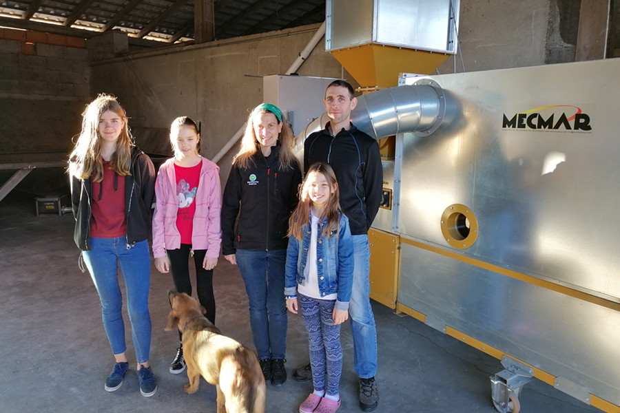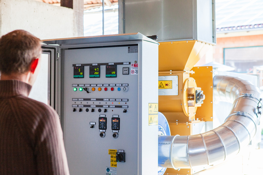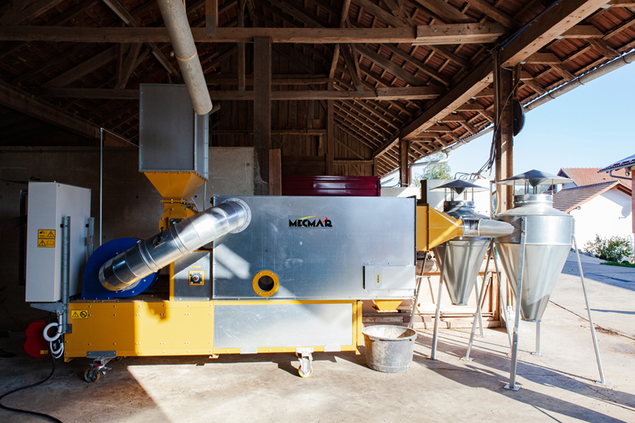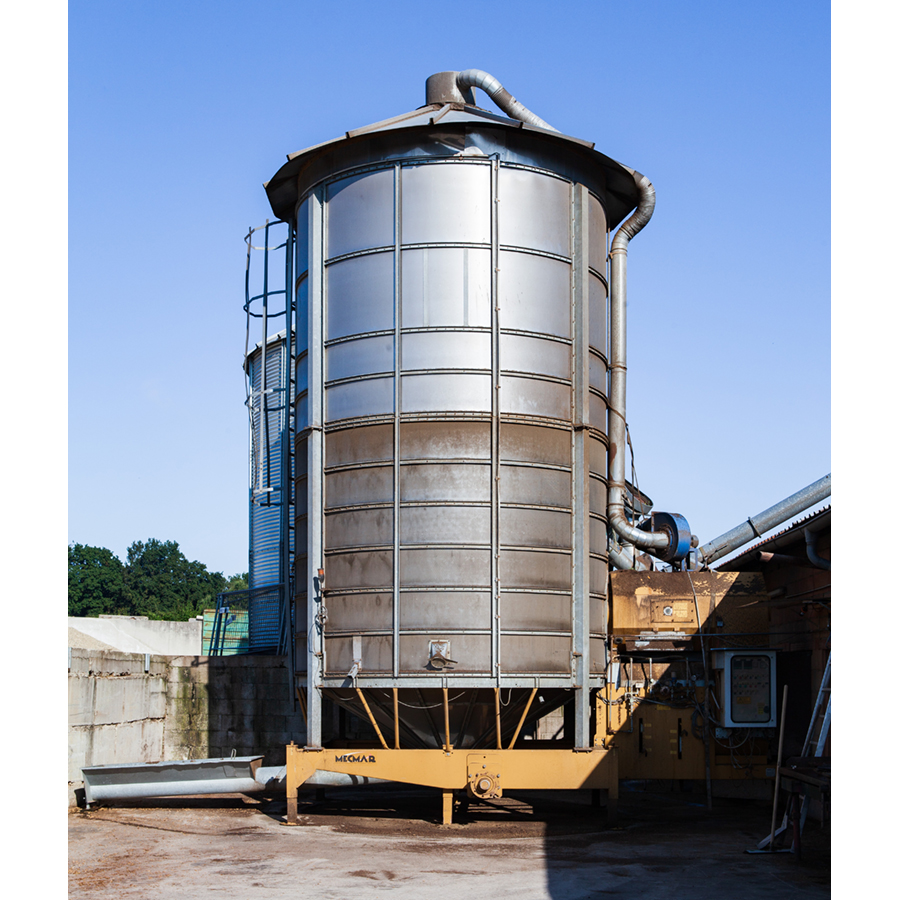 Zunächst muss die eingefahrene Ernte allerdings lagerfähig gemacht werden. Damit der ideale Feuchtegrad von 12 – 13 °C erreicht wird, der Schimmelbildung verhindert, trocknet Thomas Schuder die Sojabohnen in einem 43-t-Satzumlauftrockner bei 42 °C Korntemperatur ca. 5 bis 6 Stunden und kühlt sie anschließend in einem 150-t-Kühlsilo ungefähr einen Tag auf unter 10 °C herunter, bevor er sie bis zur Entnahme ins Endlager bringt. Von dort entnimmt er monatlich die benötigte Ration zur Aufbereitung im Sojatoaster.