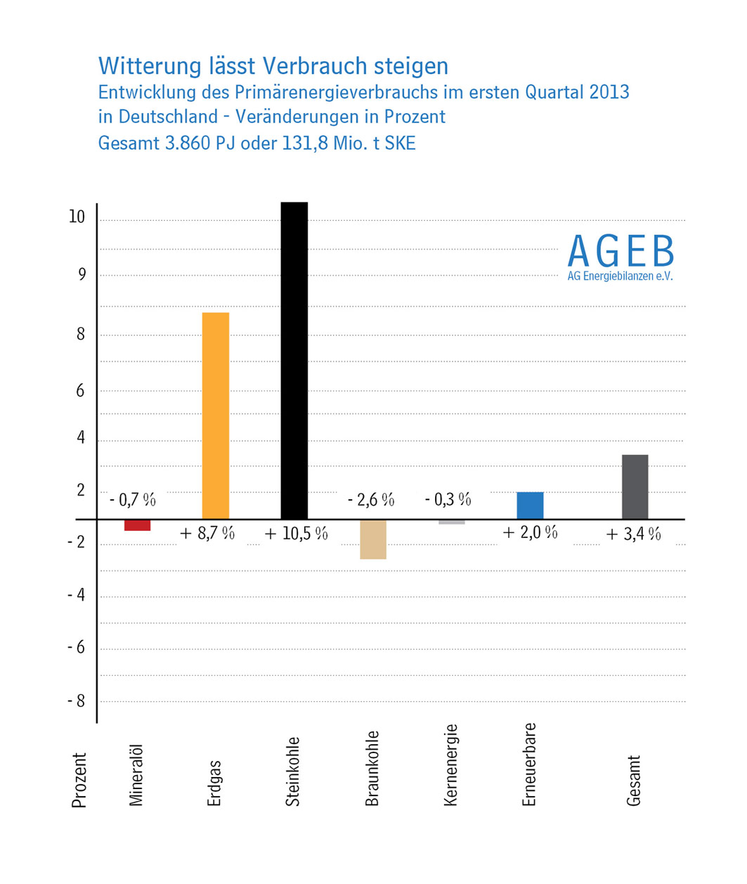 Der langanhaltende Winter und der kühle Witterungsverlauf im Frühjahr haben für einen kräftigen Anstieg des Energieverbrauchs in Deutschland gesorgt. Nach vorläufigen Berechnungen der Arbeitsgemeinschaft Energiebilanzen (AG Energiebilanzen) stieg der Verbrauch in den ersten drei Monaten um insgesamt 3,4 % auf 3860 Petajoule (PJ) oder 131,8 Millionen Tonnen Steinkohleneinheiten (Mio. t SKE). Der wachsende Energiebedarf wurde überwiegend mit konventionellen Energieträgern gedeckt.