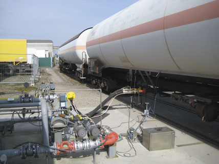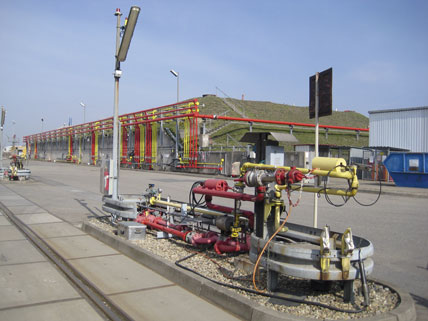 Eisenbahnkesselwagenstation mit angeschlossenen Kesselwagen. EKW können hier sowohl be- als auch entladen werden.