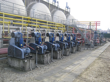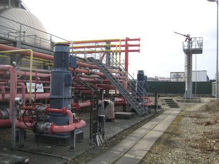 Die sechs Kompressoren bewältigen stündlich einen Mengendurchsatz von 1200 m3 Flüssiggas; anschließend die Pumpenstation.