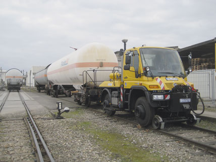 Der Zwei-Wege-Unimog kann bis zu vier EKW mit einem Gewicht von insgesamt 320 t gleichzeitig verschieben.