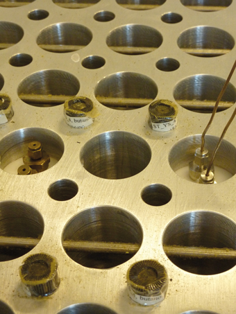 Nahaufnahme des im BioFlüssigGas Projekt entwickelten und speziell angefertigten Temperaturgradientenblocks mit Inkubationsgefäßen aus Polyoxymethylen, die hohen Temperaturen und Drücken von bis zu 20 bar standhalten.